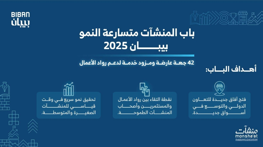 يُذكر أن ملتقى "بيبان 2025" الذي تنظمه الهيئة العامة للمنشآت الصغيرة والمتوسطة "منشآت" خلال الفترة من 5 إلى 8 نوفمبر المقبل في مركز واجهة الرياض للمعارض والمؤتمرات، يضم (7) أبواب رئيسية مبتكرة، تهدف إلى تمكين رواد الأعمال والمنشآت الصغيرة والمتوسطة، وتعزيز مساهمتهم في الناتج المحلي، وتوفير فرص النمو والتوسع في بيئة ريادية متكاملة.