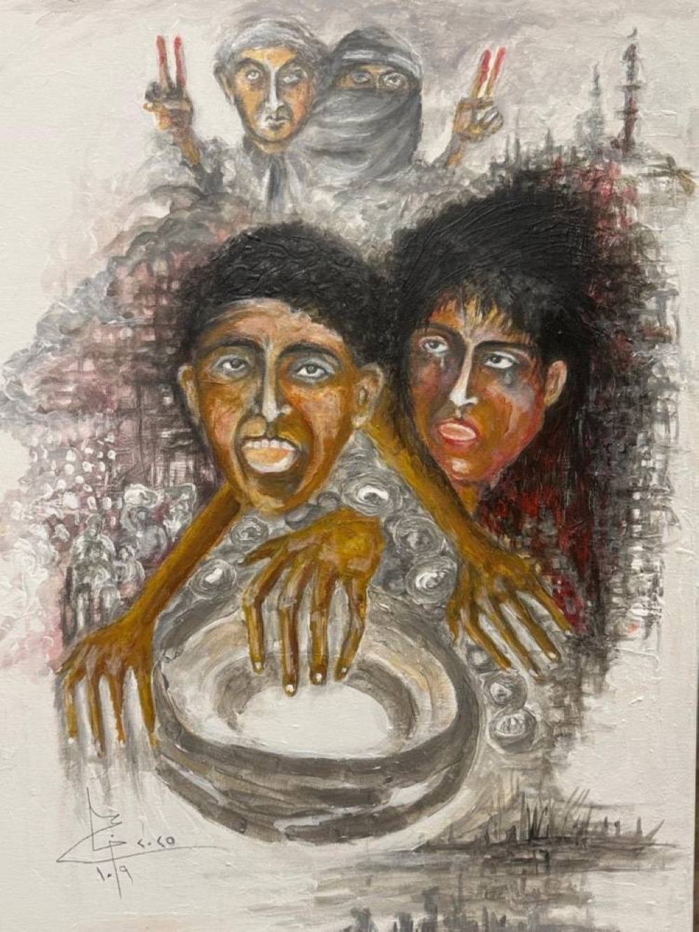 ولفت عسيري إلى أن فكرة اللوحة ليست منقولة من صورة نسخ ولصق، بل هي تصور عام لحال أهل غزة، وتمثل (فتاة وصبيا) في وسط اللوحة والمحور الأساسي لها، حيث الصبي يصرخ من الجوع ويمد الإناء الفارغ لعله يحصل على ما يأكله، فيما الفتاة كذلك تبكي وتحترق من أجل النظر إلى أي بارقة أمل في الحصول على طعام، كما تبدو الأيدي من الخلف وتمثل أيدي سكان آخرين لم يستطيعوا الوصول إلى المقدمة واكتفوا بمد أيديهم لعلها تلمس شيئًا من خلف الزحام.