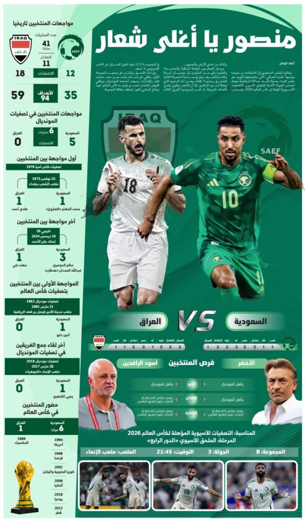 ويدخل الصقور الموقعة المرتقبة والحاسمة، والعابرة بأي من المنتخبين إلى مونديال أمريكا وكندا والمكسيك، وهو في صدارة المجموعة الثانية للملحق برصيد 3 نقاط، وهو ذات الرصيد الذي يملكة أسود الرافدين، إلا أن الأخضر يتفوق بفارق الأهداف المسجلة، إذ كسب إندونيسيا الفريق الثالث في المجموعة 2/3، فيما تفوق العراق على الأحمر الإندونيسي 1/صفر.