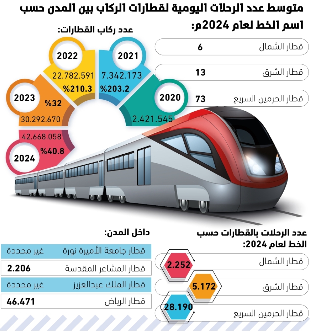 وأظهرت قراءة «الوطن» لأحدث بيانات الهيئة العامة للإحصاء، أن الانطلاقة الحقيقية للقطاع جاءت بعد عام 2020، حيث تضاعف عدد الركاب من نحو 2.4 مليون في ذلك العام إلى 7.3 ملايين في 2021، بزيادة بلغت 203.2%. وواصل هذا النمو تصاعده ليصل إلى 22.7 مليون راكب في 2022 بزيادة 210.3%، قبل أن يستقر النمو عند مستوى سنوي قوي بلغ 32% في 2023 وصولًا إلى القفزة الأخيرة في 2024 بنسبة 40.8%، ويرجع هذا التسارع بشكل مباشر إلى دخول مشاريع عملاقة الخدمة بكامل طاقتها، وبالأخص «قطار الحرمين السريع» ومترو «قطار الرياض».
