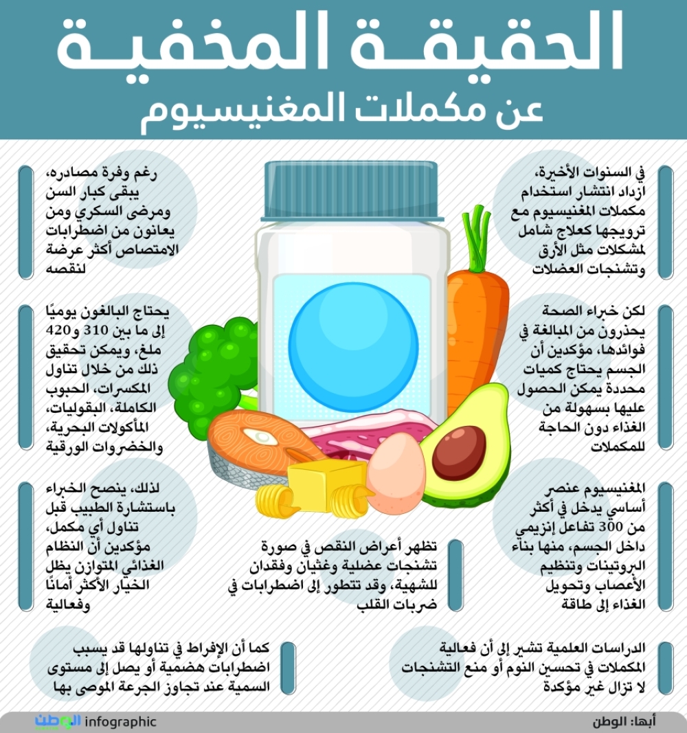 * المغنيسيوم عنصر أساسي يدخل في أكثر من 300 تفاعل إنزيمي داخل الجسم، منها بناء البروتينات وتنظيم الأعصاب وتحويل الغذاء إلى طاقة.