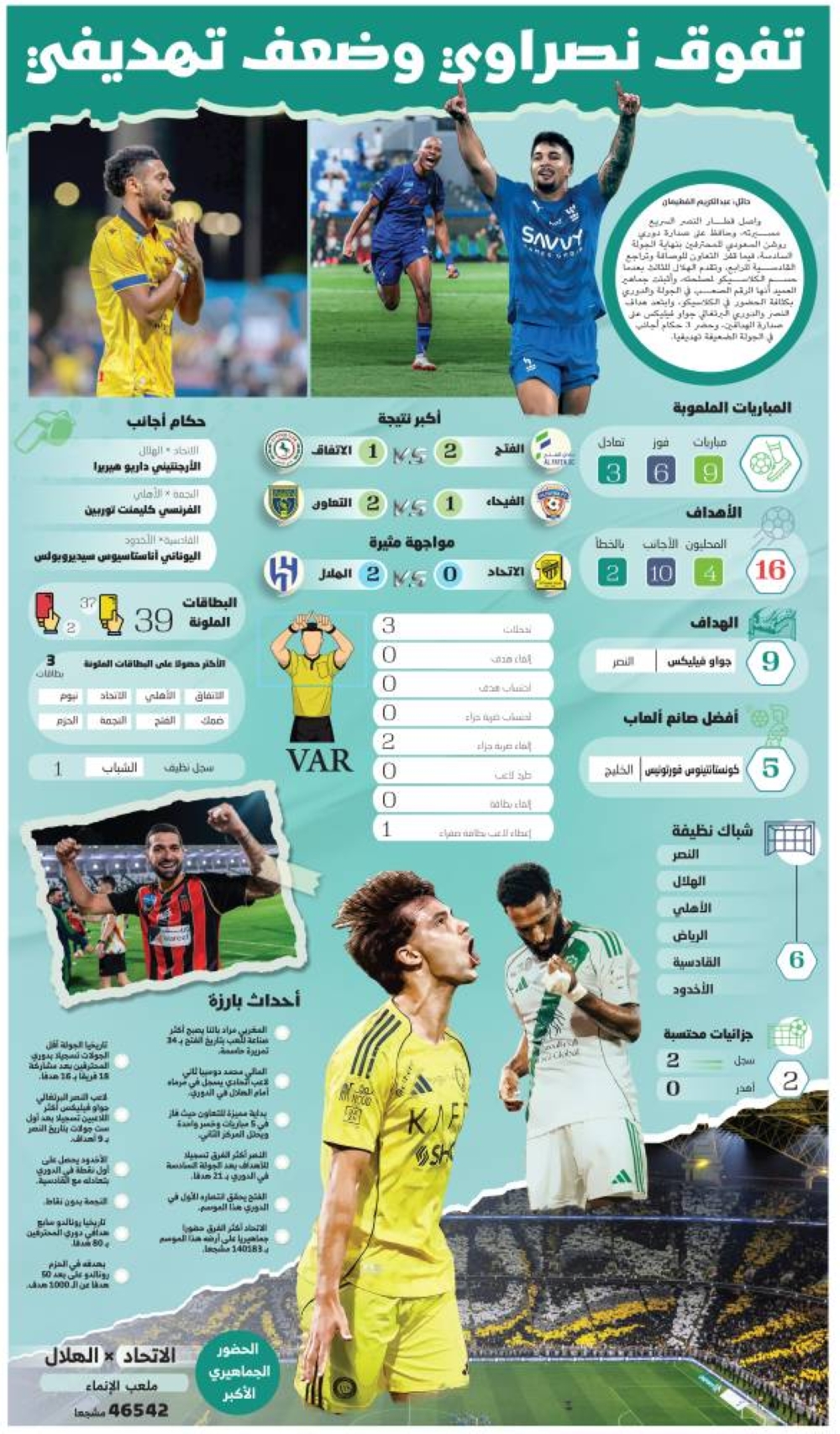 واصل قطار النصر السريع مسيرته، وحافظ على صدارة دوري روشن السعودي للمحترفين بنهاية الجولة السادسة، فيما قفز التعاون للوصافة وتراجع القادسية للرابع، وتقدم الهلال للثالث بعدما حسم الكلاسيكو لمصلحته، وأثبتت جماهير العميد أنها الرقم الصعب في الجولة والدوري بكثافة الحضور في الكلاسيكو، وابتعد هداف النصر والدوري البرتغالي جواو فيليكس على صدارة الهدافين، وحضر 3 حكام أجانب في الجولة الضعيفة تهديفيا.