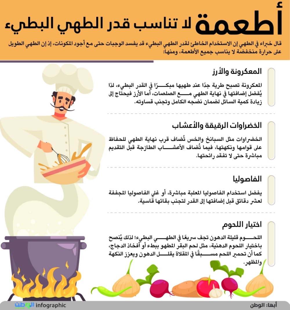 اللحوم قليلة الدهون تجف سريعًا في الطهي البطيء؛ لذلك يُنصح باختيار اللحوم الدهنية، مثل لحم البقر المطهو ببطء أو أفخاذ الدجاج، كما أن تحمير اللحم مسبقًا في المقلاة يقلل الدهون ويعزز النكهة والمظهر.
