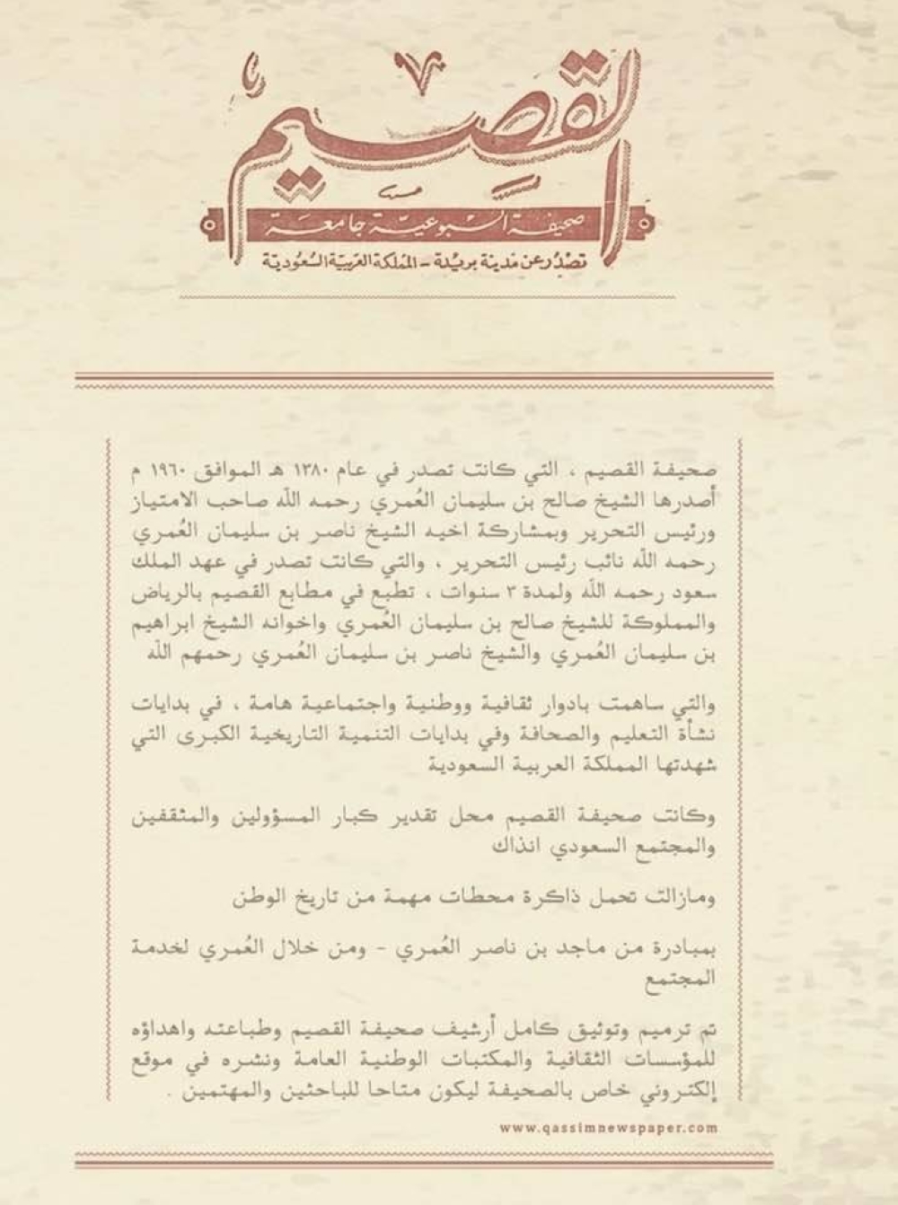 وما يزيد ما قامت به «العمري لخدمة المجتمع» نفاسةً وأثراً باقياً هو إتاحة تلك الأعداد، التي طبعت في خمس ملازم كبيرة، بالكامل في موقع إلكتروني مرتب سهل الاستخدام، يتيح للضيف طباعة المادة إن أراد.