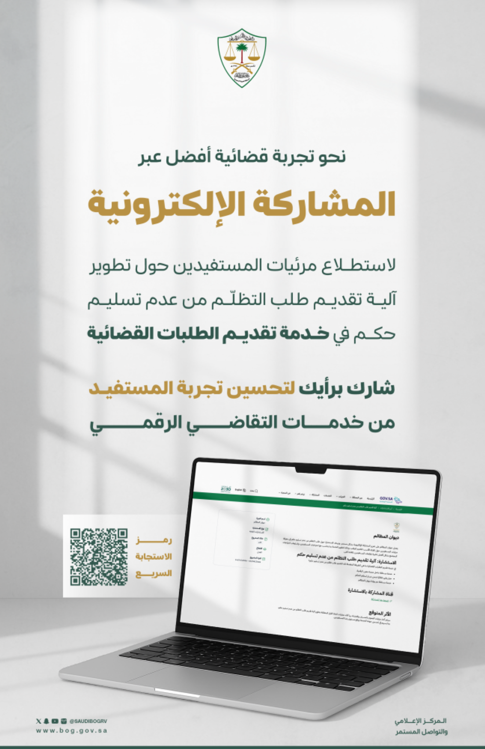 ويؤكد ديوان المظالم، بمتابعة معالي رئيس ديوان المظالم رئيس مجلس القضاء الإداري د. علي بن أحمد الأحيدب وبناءً على توجيهه، أن تضمين مرئيات المستفيدين في تطوير الخدمات يُعد أحد الممكنات الرئيسة لتحسين تجربة التقاضي الرقمي وتعزيز كفاءة المنصات القضائية، بما يحقق الأهداف التطويرية المنشودة ويرتقي بجودة الأداء، داعيًا المستفيدين إلى المشاركة بآرائهم عبر الاستطلاع؛ للإسهام في تطوير منظومة الخدمات القضائية الرقمية.