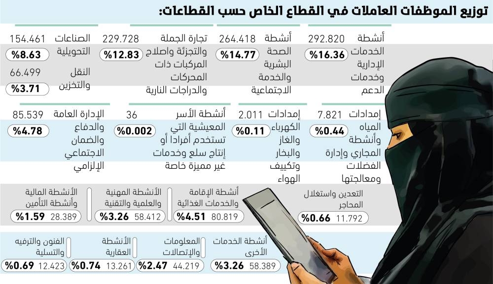 أما قطاع المعلومات والاتصالات فسجل 44.219 موظفة بنسبة 2.47%، بينما بلغ عدد الموظفات في الأنشطة المالية وأنشطة التأمين 28.389 موظفة بنسبة 1.59%.