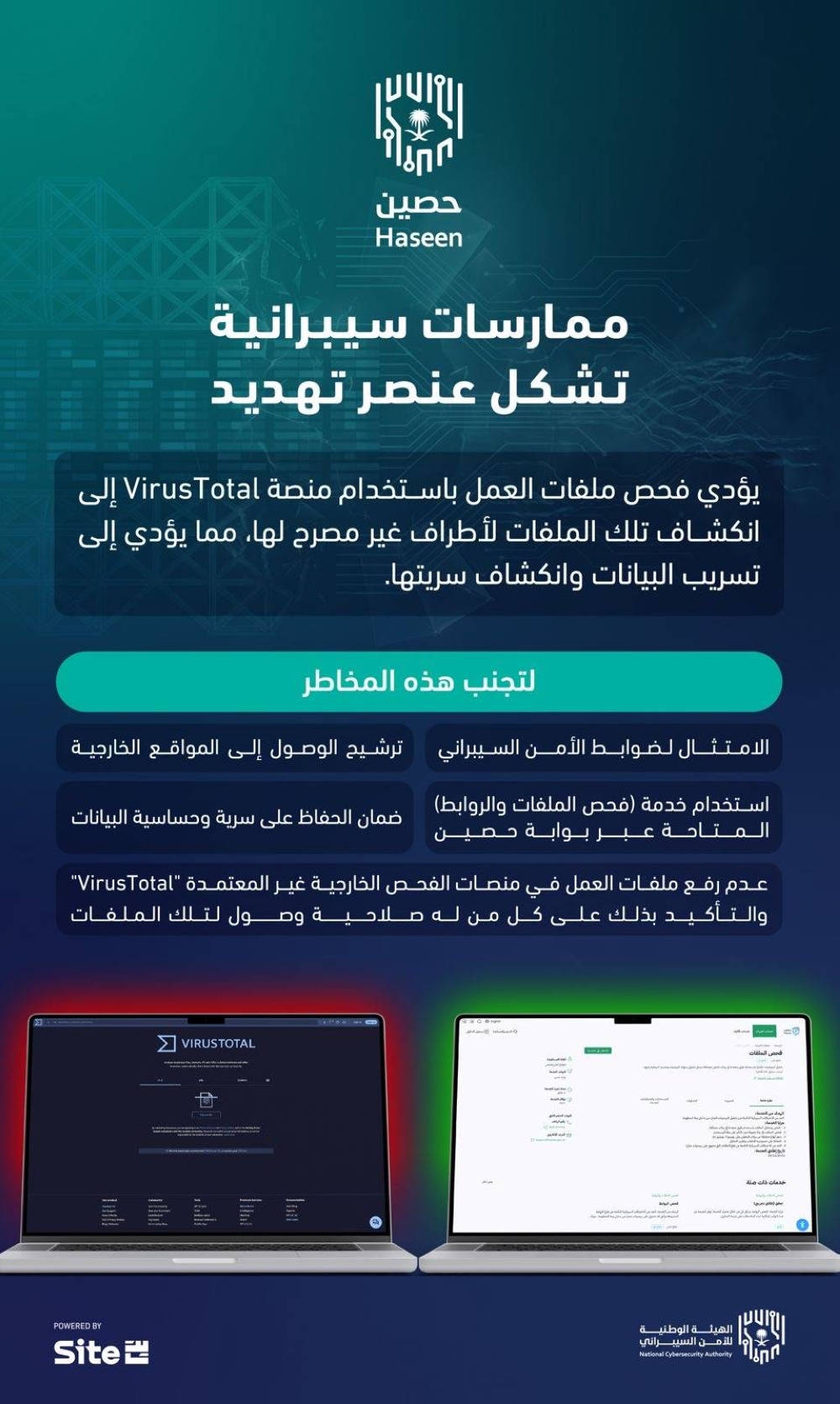 وشددت «حصين» على ضرورة الالتزام بضوابط الأمن السيبراني المعتمدة، وعدم استخدام المنصات الخارجية لفحص الملفات، والاعتماد بدلًا من ذلك على الخدمات الوطنية الموثوقة، مثل أدوات فحص الملفات والروابط المتاحة عبر البوابة.