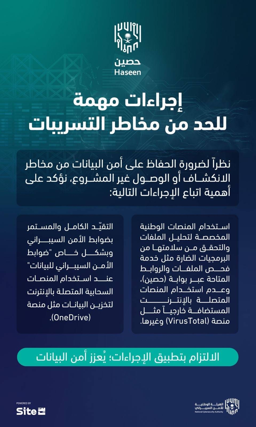 كما أوصت بالالتزام بإجراءات مهمة للحد من التسريبات، منها: استخدام المنصات الوطنية المخصصة لتحليل الملفات والتحقق من سلامتها من البرمجيات الضارة مثل خدمة فحص الملفات والروابط المتاحة عبر بوابة (حصين)، وعدم استخدام المنصات المتصلة بالإنترنت المستضافة خارجياً مثل منصة (Virustotal) وغيرها.