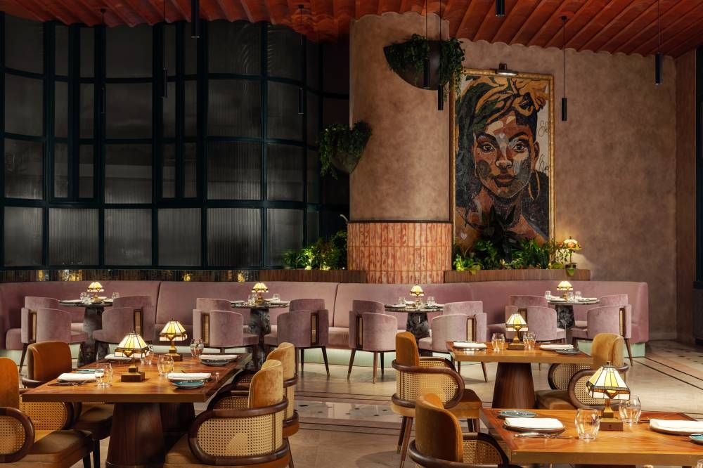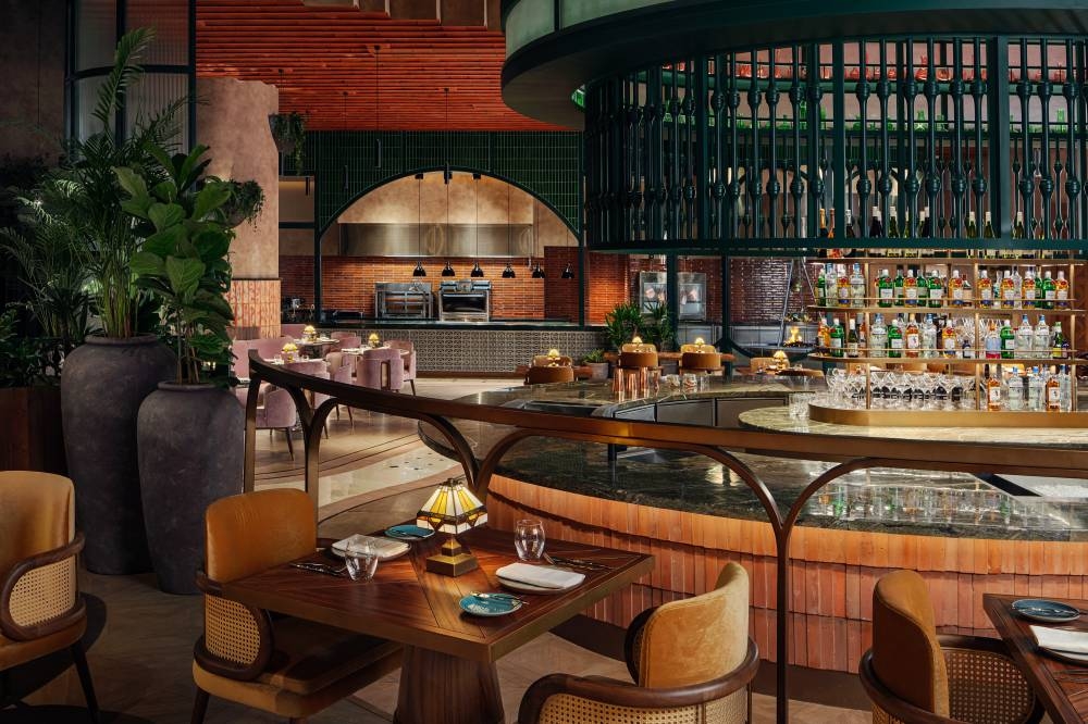 تستقبل الردهة الضيوف ضمن مساحة شاهقة ذات طابع سينمائي، تتوزّع فيها مناطق نابضة بالحيوية وأخرى أكثر هدوءاً، بما يتيح لهم اللقاء، وتناول الطعام، والاسترخاء ضمن تجربة واحدة. وتتوسط المكان قطعة منسوجة ضخمة بطول ستة أمتار للفنان السعودي عبد الناصر غارم، تحيط بها عناصر تصميمية منحوتة وستائر لافتة تمتد من الأرض حتى السقف، في إشارة إلى بدايات فن الحياكة. ومن هناك، تقود وحدات الإنارة المميّزة إلى صالة دبليو، المستوحاة من أماكن التجمّع التقليدية حول مواقد النار البدوية، مع جلسات دائرية مريحة وطاولات منخفضة تتزيّن بنقوش ذهبية. ومع حلول المساء، تتحوّل الوجهة من مساحة دافئة للأحاديث والتجمّعات إلى مشهد اجتماعي نابض بالحياة، مع عروض موسيقى حيّة، وفعاليات مؤقتة، وتجارب فنية غامرة.