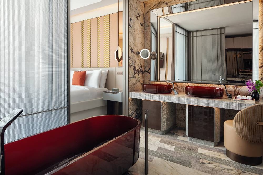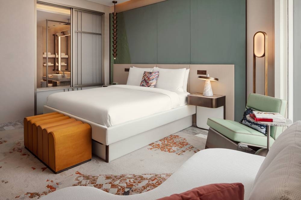يضم الفندق 210 غرف وأجنحة بتصميم أنيق، تشمل 17 جناحاً، وجناحَي بنتهاوس، إلى جانب بنتهاوس دبليو. وقد صُمّمت الغرف لتكون مساحات هادئة، وتتميّز بتدرّجات من الأخضر، والياقوتي، والذهبي، والبرونزي، إلى جانب منسوجات هندسية جريئة وأعمال فنية جدارية تجمع بين الحروف الإنجليزية والعربية من إبداع عبد الناصر غارم. أما أجنحة البنتهاوس، فجاءت رحبة وأنيقة لتوفّر أجواء مثالية للقاءات والتجمّعات، مع نوافذ واسعة تنفتح على إطلالات على وسط مدينة الرياض. ويمتد بنتهاوس دبليو على مساحة 390 متراً مربعاً، ويضم غرفتي نوم، ومساحات مستقلة للجلوس والطعام، ومطبخاً صغيراً، إلى جانب مكتب ومنطقة رياضية مع غرفة بخار وساونا. كما يحتضن عملاً فنياً ممتداً من الأرض حتى السقف، مؤلفاً من كرات خشبية مضيئة تستحضر السُبحة، في رمز للتأمل واليقظة الذهنية.