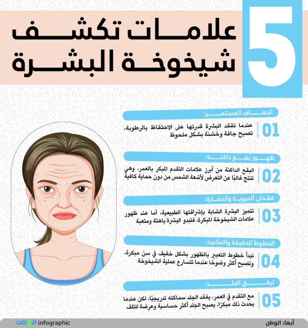فقدان الحيوية والنضارة: تتميز البشرة الشابة بإشراقتها الطبيعية، أما عند ظهور علامات الشيخوخة المبكرة، فتبدو البشرة باهتة ومتعبة.