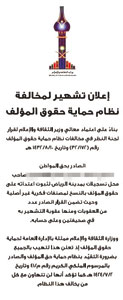 عاقبت لجنة النظر في مخالفات حماية حقوق المؤلف بوزارة الثقافة والإعلام صاحب محل تسجيلات بالرياض ثبت بحقه اعتداء على حقوق مؤلفين بنسخه مصنفات فكرية غير أصلية وبيعها، بنشر اعتذاره بصحفيتين محليتين، على حسابه الخاص للمرة الثانية.