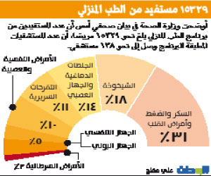 وأضاف الحزيم في تصريح صحفي أمس، أن برنامج الطب المنزلي حقق العديد من الإنجازات من خلال تفعيله عند تأسيسه في ربيع الآخر عام 1430، وأن عدد المستشفيات المطبقة لهذا البرنامج ارتفع إلى 138 مستشفى، في حين بلغ عدد الفرق الطبية الميدانية 216 فريقا، وإجمالي العاملين في البرنامج نحو 940 عاملا. ولفت إلى أن منطقة الرياض سجلت النسبة الأعلى من المستفيدين من البرنامج بنسبة 12% تلتها منطقة عسير بنسبة 11%، وجاءت منطقة المدينة المنورة بنسبة 10% ثم مكة المكرمة بنسبة 9%، ثم باقي المناطق بنسب متفاوتة، وذلك بحكم عدة عوامل منها الكثافة السكانية في المنطقة وأعداد المستشفيات والأسرة وغيرها.