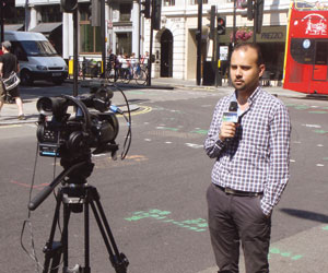 قريباً من مسارح بيكاديلي كان مراسل القناة الإخبارية السعودية كريم جوهري يلتقط (المايك) ويقف أمام الكاميرا متحدثاً عن عابرين كانوا خلفه.