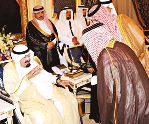 وقد بدأ الاستقبال الذي حضره ولي العهد نائب رئيس مجلس الوزراء وزير الدفاع صاحب السمو الملكي الأمير سلمان بن عبدالعزيز في قصر السلام بتلاوة آيات من الذكر الحكيم مع شرحها وتفسيرها، ثم تشرف الجميع بالسلام على خادم الحرمين الشريفين.