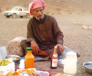 "الوطن" تواجدت أثناء الإفطار مع بعض سكان البادية، الذين ما زالوا يسكنون الخيام وبيوت الشعر، حيث أشار المعمر مسعد سعيد الجهني، الذي تجاوز الـ "90 عاما"، أنهم كانوا في الماضي القريب لايعرفون هذه المأكولات، التي ما زالوا يجهلون أسماءها، وذكر الجهني، أن أطباقهم التي اعتادوا عليها تتكون من القهوة والشاي والتمر، والماء والشوربة التي يصنعونها من الطحين واللبن، وفي حال فقدان اللبن يستبدلونه بما يسمى بـ "المريسة" التي تصنع من المضير "الإقط"، ويضاف عليه قليل من الماء والسكر.