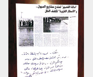 فرغم مبادرة أمانة المنطقة بإرسال رسالة (sms) لمشتركيها تعلن نجاح خطة التصريف، إلا أن غزارة الأمطار كشفت خلل المشاريع، وهو ما دفع بـ"الأمير" لطلب إفادة "الأمين".. عبر 5 أسطر كتبها على هامش ورقة بيضاء تم توثيق تغطية الصحيفة عليها.