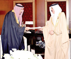 سلم ولي العهد نائب رئيس مجلس الوزراء وزير الدفاع صاحب السمو الملكي الأمير سلمان بن عبدالعزيز العاهل البحريني الملك حمد بن عيسى آل خليفة رسالة من خادم الحرمين الشريفين الملك عبدالله بن عبدالعزيز، وذلك خلال استقبال جلالته لولي العهد في المنامة أمس.