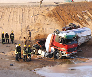 وكان الصهريج الذي يقوده أحد العمالة الآسيوية قد انحرف عن مساره، ولم يتمكن سائقه من السيطرة عليه مما أدى إلى انقلابه.