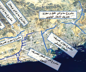 وتشمل مشاريع تصريف الأمطار والسيول لمدينة جدة ثماني مشاريع بقيمة 3.388 مليارات ريال تنفذها أربعة شركات منها اثنتان سعودية واثنتان عالمية، وهذه المشاريع هي: إنشاء خمسة سدود (سد وادي غايا، سد وادي أم حبلين، سد وادي دغبج، سد وادي بريمان، سد وادي غليل) وملحقاتها من سدود رادفة ومفيض للسدود ومجاري تصريف السيول وطرق، ورفع الطاقة الاستيعابية لمجاري تصريف السيول الشمالية، والجنوبية، والشرقية، وإنشاء قنوات جديدة لتصريف مياه الأمطار بمحاذاة مطار الملك عبدالعزيز الدولي.