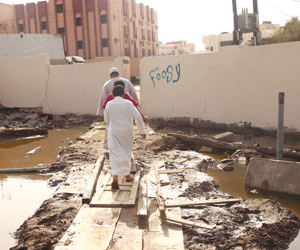 فيما يضطر سكان حي الروضة الشمالي بمدينة جازان إلى الاستعانة بأحد مساجد مواقف أمانة منطقة جازان المخصص لوقوف الآليات والمعدات الثقيلة، لعدم وجود مسجد بحيهم، يجدون صعوبة للوصول إليه نظرا لما يحيط به من مياه راكدة ومستنقعات خلفتها الأمطار الأخيرة، وهو ما دفعهم لإنشاء جسور خشبية فوق المياه الراكدة للوصول للمسجد لأداء الصلاة.