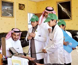 وكان طلاب المدرسة قد زاروا الأربعاء الماضي وهم يرتدون الزي الطبي، المدير العام جلوي آل كركمان ومساعديه، برفقة مدير المدرسة حسن عسيري، والمرشد الصحي سعيد السرحاني، وذلك لإجراء فحص العلامات الحيوية لهم المشتملة على درجة الحرارة قياس مستوى ضغط الدم.