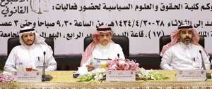 من جانبه، شدد عميد كلية الحقوق والعلوم السياسية الدكتور صالح الخثلان على حرص الجامعة على دعم وتوفير كافة الفرص التي تعزز مهارات الطلاب والطالبات وترتقي بقدراتهم التنافسية مع أقرانهم من جامعات المملكة. ثم تحدث عن أهداف الأسبوع القانوني، مبينا أن أبرز أهداف هذا الأسبوع وما يشتمل عليه من محاضرات وحلقات نقاش وورش عمل هو تهيئة طلاب وطالبات كلية الحقوق والعلوم السياسية في تخصص القانون لسوق العمل من خلال التعرف على الفرص المتاحة والاستفادة من خبرات أصحاب السعادة المحامين ومديري الشؤون القانونية في عدد من الجهات الحكومية.