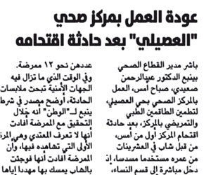 وكان مدير القطاع الصحي بينبع الدكتور عبدالرحمن صعيدي، باشر العمل بالمركز الصحي بحي العصيلي نهاية الأسبوع الماضي، لتطمين الطاقمين الطبي والتمريضي بالمركز، بعد حادثة اقتحام المركز.