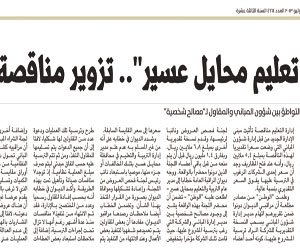 يذكر أن ديوان المراقبة العامة سجل عمليات تزوير ضد قياديين بإدارة تعليم محايل عسير، تمثلت في فتح مظاريف مناقصات وتعديل عطاءات شركات مقاولات لتتطابق مع السعر التقديري لمشروع تأثيث مبنى إدارة التعليم، والبالغ 5.4 ملايين ريال. وجاء رصد الديوان لهذه العمليات خلال فحصه أداء إدارة التربية والتعليم في محافظة محايل عسير، حيث كشف المراقبون طرح إدارة التعليم مناقصة تأثيث مبنى الإدارة الجديد من قبل إدارة شؤون المباني التي وضعت سعرا تقديريا لهذه المناقصة بمبلغ 5.4 ملايين ريال، وأنه عند فتح المظاريف وجد أن سعر إحدى الشركات المرغوب في الترسية عليها يفوق السعر التقديري بنسبة عالية.