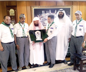 وأشار خلال استقباله أمس لعدد من قيادات الكشافة بمكة المكرمة المشاركين في مركز رسل السلام الكشفي الرمضاني إلى أن الرئاسة ترحب في المشاركة بتوجيه الشيوخ لإلقاء المحاضرات الدينية والتي تعمق مفهوم الخدمة والأخلاق الحميدة للشاب المسلم والأجر العظيم لمثل هذه الأعمال الجليلة وأهمية الظهور بالمظهر اللائق لأبناء المملكة أمام الزوار ونقل الصورة المثلى للعالم أجمع. واستمع الدكتور السديس للدور الذي تقدمه كشافة وزارة التربية والتعليم من أعمال تخدم البلد والمجتمع على المستوى مناطق ومحافظات المملكة واهتمامها بالبرامج التي تقدم في الحرمين الشريفين.