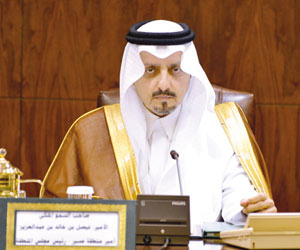 جاء ذلك، لدى ترؤسه أمس، اجتماع مجلس المنطقة في جلسته الأولى من دورته العادية للعام المالي 1434 / 1435. وأكد الأمير فيصل بن خالد على أعضاء المجلس الممثلين للجهات الحكومية وكذلك الأهالي الالتزام بمواعيد جلسات المجلس وعدم إنابة أحد إلا في أقصى حالات الضرورة، وأهمية دور أعضاء المجلس في هذه المرحلة التي تشهد تنفيذ مشاريع تنموية وتحتاج إلى متابعة من الجميع ومعالجة أسباب التأخر أو التعثر لأي مشروع.