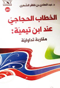 * "الخطاب الحجاجيّ عند ابن تيمية: مقاربة تداولية"، كتاب لمؤلفه الدكتور عبدالهادي بن ظافر الشهري من القطع المتوسط، 542 صفحة، يتناول فيه مفهوم الخطاب الحجاجي الذي عدّه المؤلف من أفضل وسائل التّواصل السلميّة لحل الاختلافات، ومكوناته، ومقارباته التداولية، وأطواره، ودواعي الاختلاف، والأصول النظرية، وبناء الخطاب الحجاجي وترتيبه، واستصفاء رؤيته التداوليّة عن منطق الخطاب الحجاجيّ، الذي ثبت بأنّه لم يعد إلا المنطق التّداوليّ، ليصبح هو المنطق الملائم فيما يمكن أن نسميه المنوال البديل.