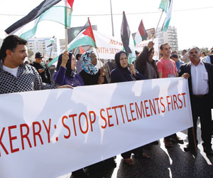 واستقبل كيري في مدينة بيت لحم بمظاهرة شارك فيها العشرات من الفلسطينيين وهم يلوحون بالأعلام الفلسطينية احتجاجا على زيارته والموقف الأميركي الرافض للضغط على إسرائيل لوقف الاستيطان. وانتشرت قوات كبيرة من الأمن الفلسطيني بمحيط المظاهرة لمنعها من المساس بموكب كيري الذي وصل بيت لحم بعد لقاء مع نتنياهو بالقدس الغربية.
