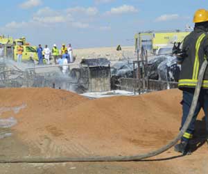 وبين ان الفرق كافحت الحريق باستخدام مادة الرغاوي من ثلاث محاور في مواجهة ثلاث خزانات مساحة الواحد منها 10 متر مربع تحتوي على مادة الديزل.