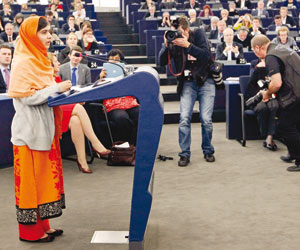 ووجهت ملالا "نداء إلى أوروبا لمساعدة دول آسيا وباكستان في مجال التعليم والتنمية". يذكر أن مسلحا استهدف الفتاة لأنها انتقدت هيمنة حركة طالبان على منطقتها وادي سوات شمال غرب باكستان، ودافعت عن حق البنات في التعليم، في 9 أكتوبر 2012 عندما كانت في حافلة مدرسية. ونجت ملالا يوسف زاي من الموت، وأصبحت بفضل مقاومتها رمزا عالميا.