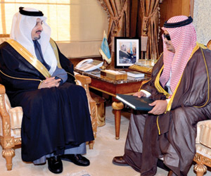 من جهة أخرى أشاد الأمير فيصل بن خالد بالجهود التي تبذلها مصلحة الجمارك العامة في ضبط حركة المنافذ الحدودية.. جاء ذلك خلال استقباله في مكتبه بالإمارة صباح أمس مدير جمرك منفذ علب عادل بن حمد عبدالقادر الذي قدم للسلام عليه وتسليمه التقرير السنوي لإنجازات الجمارك على مستوى المملكة.