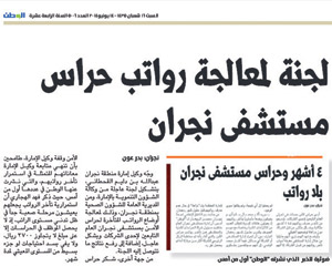 تفاعلت إمارة منطقة نجران مع ما نشرته "الوطن" في عددها الصادر بتاريخ 14/6/2014 حول معاناة حراس الأمن بمستشفى نجران العام لعدم صرف رواتبهم.