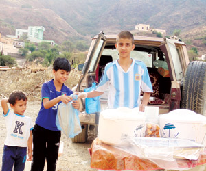 على امتداد الطريق العام رجال ألمع - أبها وفي مركز العوص، يحمل الطفل محمد إبراهيم محمد محي البالغ من العمر 15 عاما، هم أسرته المكونة من الأب والأم وعدد كبير من إخوته بنين وبنات، إذ يحمل بكل جدية ونشاط وأمانة لواء تاجر المستقبل، فمنذ الواحدة ظهرا تنهض والدته بمساعدة باقي أفراد الأسرة من البنات في إعداد الوجبات الرمضانية استعداداً لبيعها على عابري الطريق.
