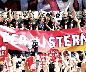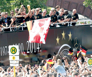 احتشد نحو مليون مشجع ألماني لاستقبال منتخب بلادهم المتوج بكأس العالم لكرة القدم لكرة القدم بعد عودته إلى برلين أمس ورفع المشجعون لافتات كتب عليها "نحن أبطال العالم" وذلك بعدما فاز الفريق باللقب للمرة الرابعة الأحد الماضي.