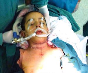 وأضاف أن "لطف الله ورحمته أنقذا ابني عندما تمكنت والدته من دخول الغرفة، فوجدت العاملة وهي تغافل الطفل وتأتيه من الخلف، وتمرر السكين على رقبته نحرا، وعندما فوجئت بدخول أمه ارتبكت، وتوقفت عن إكمال جريمتها، مما عرض الطفل لقطع في الرقبه بعمق خمسة سنتيمترات، وعلى الفور تم نقله إلى المستشفى، وأدخل غرفة العمليات، حيث خضع لعملية جراحية، ومازال في العناية المركزة حتى الآن".