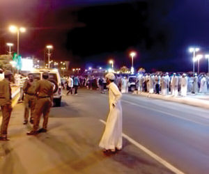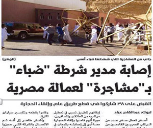 الناطق الإعلامي لشرطة منطقة تبوك المقدم خالد بن أحمد الغبان، أوضح عبر بيان صدر أمس: "بأنه عند الساعة العاشرة من مساء الأحد قام عدد من العمالة الموسمية المصرية في مجمعات الهدي والأضاحي خلال موسم حج هذا العام 1435، والبالغ عددهم 1700 عامل، بإثارة الشغب بعد تأخر وصول العبارة الناقلة لهم، وأغلقوا الطريق الدولي، وأشعلوا النار في إطارات السيارات، وقذفوا الحجارة على المارة، ما نتج عنه إصابات وتلفيات في المركبات".