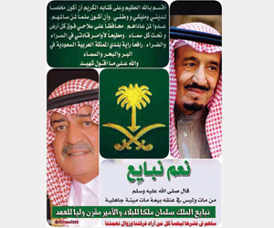 مواقع التواصل كانت أيضا ساحة مفتوحة لمبايعة الملك سلمان بن عبدالعزيز ملكا، والأمير مقرن بن عبدالعزيز وليا للعهد، يقول عادل محمد عبده: أنا عادل محمد سليمان عبده أبايع صاحب السمو الملكي الأمير سلمان بن عبدالعزيز آل سعود ملكا للمملكة العربية السعودية، وأبايع صاحب السمو الملكي الأمير مقرن بن عبدالعزيز وليا للعهد، وأبارك لهما، وللعائلة المالكة وللشعب السعودي، وبإذن الله الوطن من خير إلى خير.