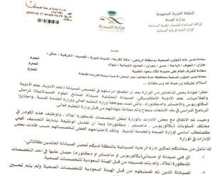 ووجه وكيل الوزارة الدكتور طريف الأعمى في خطاب - حصلت " الوطن" على نسخه منة - إلى كافة إدارات الشؤون الصحية في مختلف مناطق المملكة بموافاة الوزارة خلال شهر والإفادة بإرسال بيانات الصيادلة والفنيين العائدين الذين أنهوا دراستهم ضمن برنامج خادم الحرمين للابتعاث في المراحل التعليمية الثلاث البكالوريوس والماجستير والدكتوراه ولم يتم تصنيفهم من الهيئة السعودية للتخصصات الصحية.