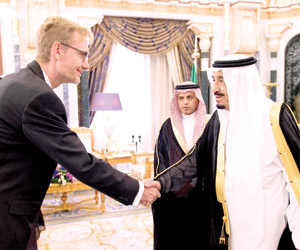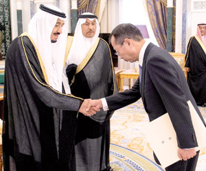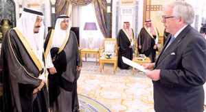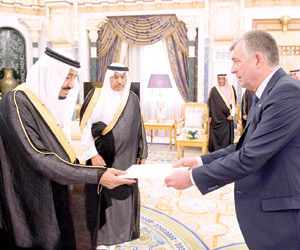وتسلم خادم الحرمين أوراق اعتماد كل من سفير مملكة الدنمرك أولي فريس مادسين، وسفير دولة قطر الشيخ عبدالله بن ثامر، وسفير جمهورية قيرغيزستان عبداللطيف جومابايف، وسفير جمهورية التشيك يرجي سلافيك، وسفير مملكة بلجيكا جيرت كريل، وسفير مملكة النرويج رولف ويلي هانسن، وسفير جمهورية جورجيا جورج جانجغافا، وسفير جمهورية أيرلندا جوزيف أنتوني كوتر، وسفير سويسرا هاينزخ شيلينبيريج، وسفير هنقاريا فيرينس تشيلاج، وسفير جمهورية غانا الحاج سعيد سيناري، وسفير جمهورية طاجيكستان شريبوف أعظمشا، وسفير جمهورية تونس لطفي بن قايد، وسفير جمهورية أوكرانيا فاديم فاخروشيف، وسفير جمهورية باكستان الإسلامية منظور الحق، وسفير جمهورية ألبانيا سامي شيبا، وسفير المملكة المتحدة سايمون بول كوليز، وسفير جمهورية بنجلاديش الشعبية غلام موشي، وسفيرة جمهورية سلوفينيا تتيانا ميشكوفا "غير مقيمة"، وسفير جمهورية بيلاروسيا رومان جولوفتشينكو "غير مقيم"، وسفير أستراليا الدكتور رالف بيتر هيريرت كينج، وسفير اليابان نوريهيرو أوكاودا. وأجريت للسفراء المراسم المعتادة في مثل هذه المناسبة.