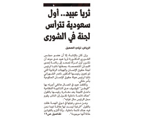 حسم مجلس الشورى وبغالبية أعضائه، مصير كرسي رئاسة لجنة حقوق الإنسان والهيئات الرقابية الذي بات شاغرا عقب تعيين رئيسها السابق الدكتور ناصر الشهراني نائبا لرئيس هيئة حقوق الإنسان الحكومية، وذلك لمصلحة العضو ثريا عبيد، لتكون بذلك أول امرأة تصعد إلى هذا المنصب في سابقة برلمانية هي الأولى منذ دخول النساء إلى المجلس التشريعي.