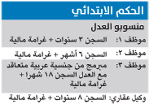 وتضمن الحكم السجن الذي كان أقصاه للوكيل العقاري ثماني سنوات، وأدناه السجن 6 أشهر لأحد المدانين الآخرين، إضافة إلى الغرامة المالية التي كان أدناها 10 آلاف ريال، وأقصاها مليون ريال.
