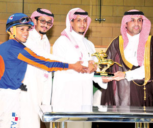 وسلم القرني كأس السباق عقب نهاية الشوط السابع "إنتاج" ضمن حفل السباقات الثامن عشر لنادي الفروسية.