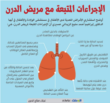 سجلت وزارة الصحة 2336 إصابة بالدرن الرئوي العام الماضي، بمعدل 7.59 حالة لكل 100 ألف نسمة، مسجلة بذلك انخفاضاً قدره 0.75 حالة عن العام الذي سبقه 2013، ويرجع ذلك إلى التحسن المستمر في رصد الحالات والتبليغ عنها، إضافة إلى التوعية المستمرة.