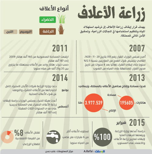 وجاء قرار مجلس الوزراء أمس بوقف زراعة الأعلاف، بعد استكمال وزارة الزراعة ممثلة بالمؤسسة العامة لصوامع الغلال ومطاحن الدقيق، شراء واستلام كامل محصول القمح البالغ نحو 722 ألف طن إجمالي الكميات التي تم استلامها من المزارعين والشركات الزراعية لهذا العام، تنفيذا لقرار توجه السعودية لإيقاف الهدر المائي في زراعة القمح نهائيا بحلول العام 2016.