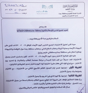 الخطاب المرفق من المدير العام لتعليم محافظة جدة يقضي بالتعامل مع المادة المعلقة، وفق طريقتين، الأولى إدراجها ضمن جدول اختبارات الأسبوع الثاني، مع الالتزام بضوابط بناء جدول الاختبارات، والطريقة الثانية إدراجها في اليوم الذي يلي آخر يوم في جدول الاختبار، مع تأكيد إدارة تعليم جدة على ضرورة أخذ تواقيع الطلبة على جدول الاختبار المعدل، مع إشعارها بالإجراء المتخذ كتابياً.